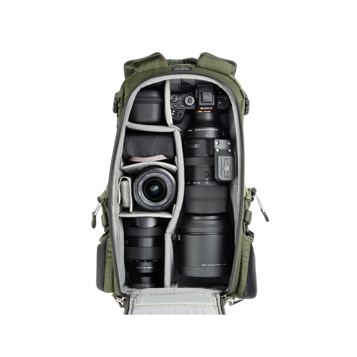 • Adjustable dividers for large telephoto lenses, traditional photo gear, or personal items
