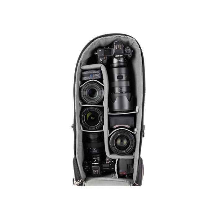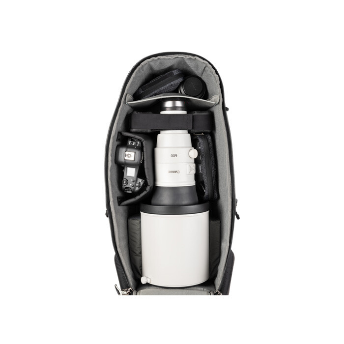 Det rummelige fotorum har plads til objektiver med en diameter på op til 8", monteret på kamera med greb og eventuel telekonverter eller adapter. Et fleksibelt system af polstrede skillevægge og støttende puder sikrer optimal beskyttelse og tilpasning til forskellige konfigurationer.