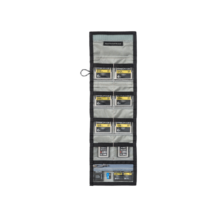Praktisk foldbar pung til 10 CFast- eller CF Express Type B-hukommelseskort i klare åbninger, plus en åbning med lynlås til mindre, løse genstande som micro SD-kort. Passer nemt i lommen eller kan fastgøres til bæltet eller tasken.