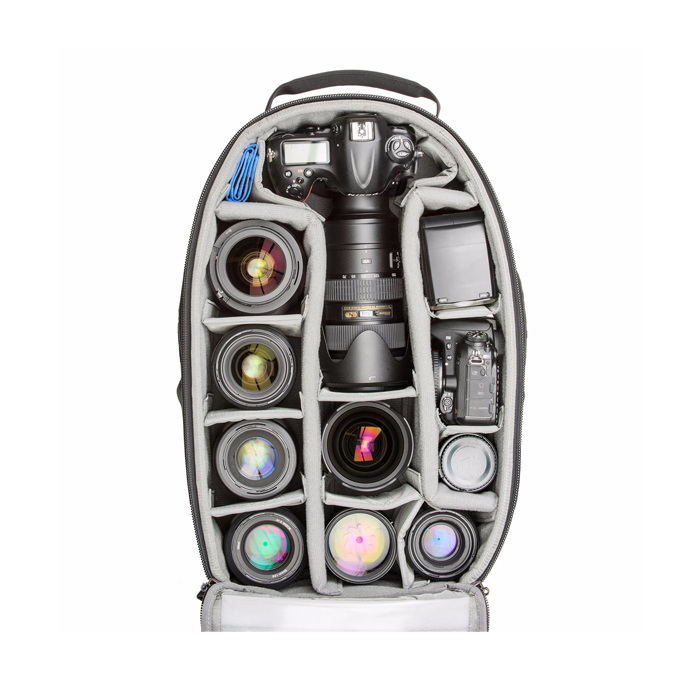 - Holds 1 gripped, 1 standard DSLR, 5–7 standard zoom lenses, a 15” laptop and a 13” tablet
