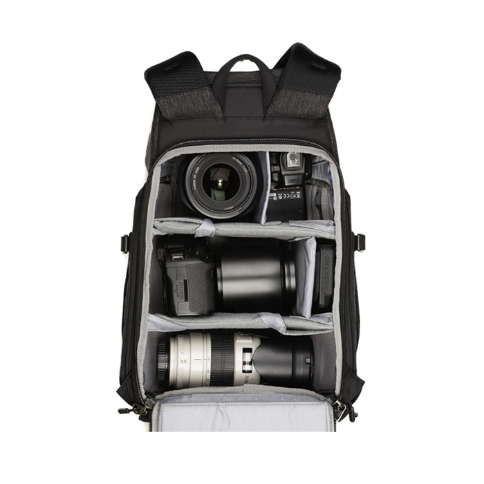 Access panels on both sides enable you to sling the backpack left or right, while the rear-panel provides complete access to your gear when working directly out of the bag. Plus, the center tripod mounting system balances even large tripods securely while still allowing access to your gear. And of course, the harness is padded and shaped for all day comfort.