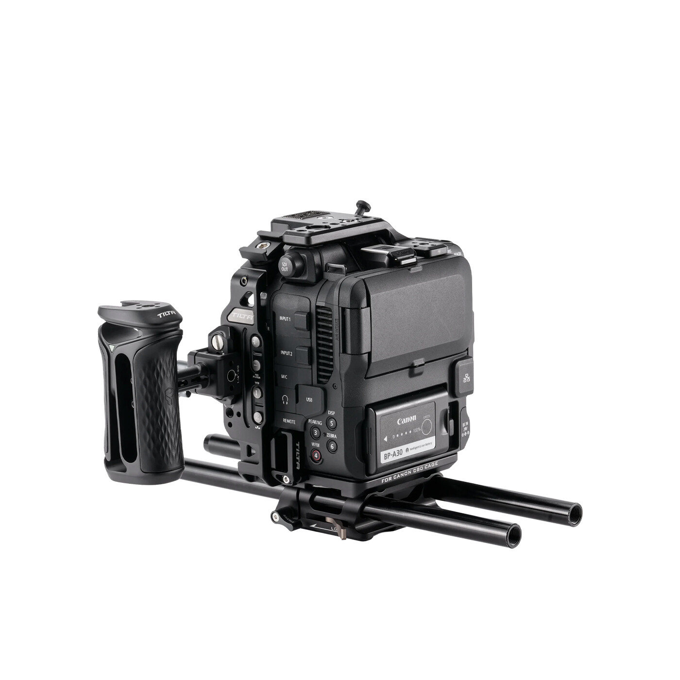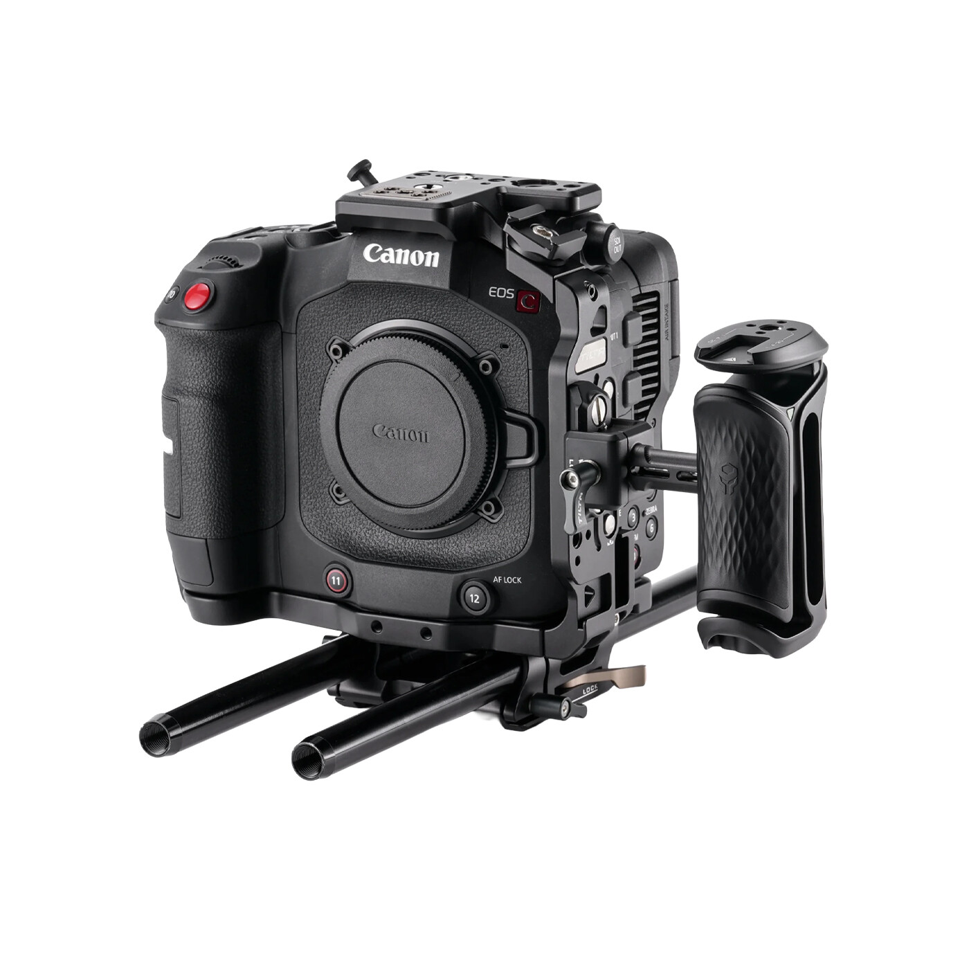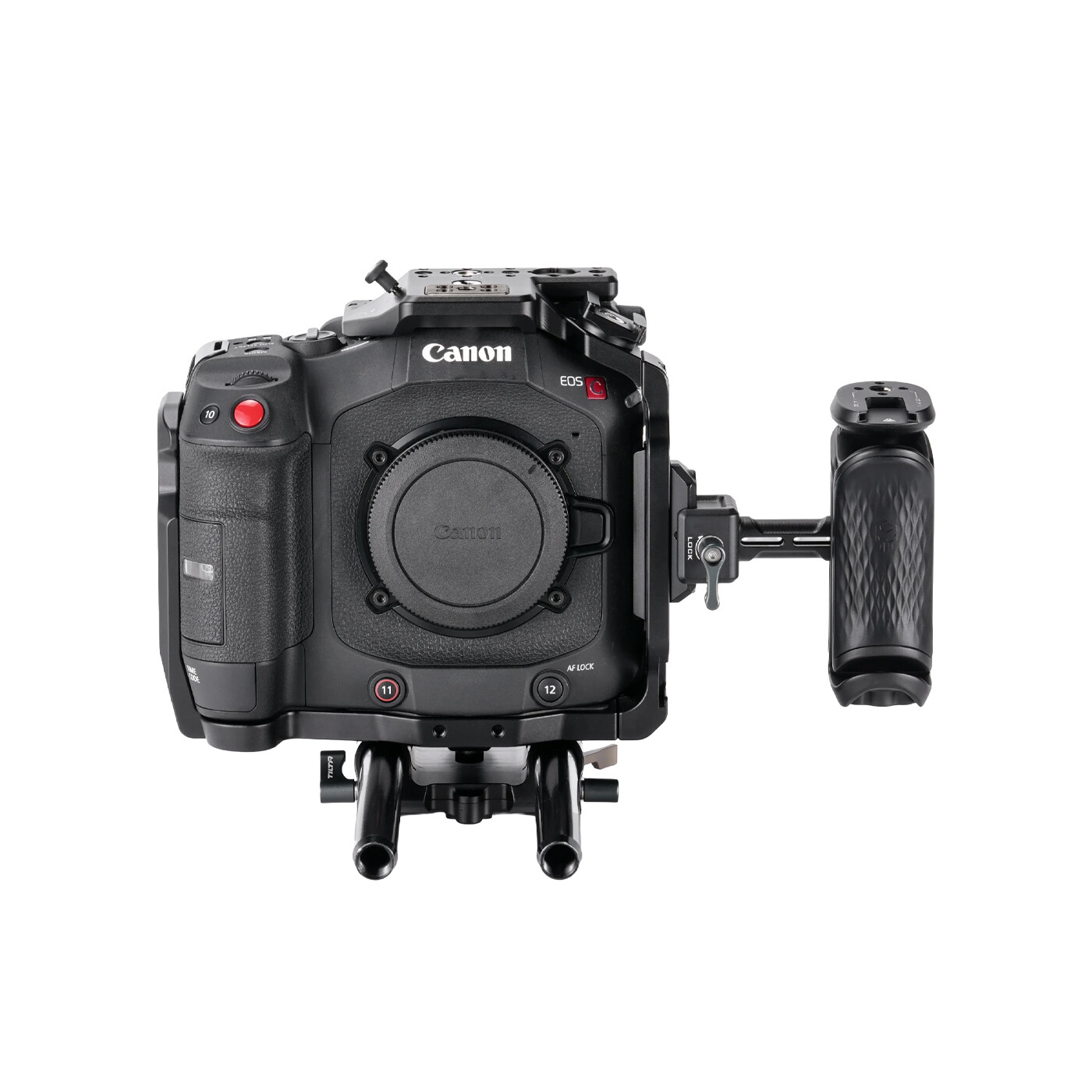 Den modsatte sideplade har gevind, som gør det hurtigt og nemt at montere kameraet i en vertikal opsætning. Toppladen er designet, så den giver fri adgang til det originale C80 topgreb, hvilket gør dette bur ideelt til brugere, der ønsker at bevare det oprindelige håndtag.