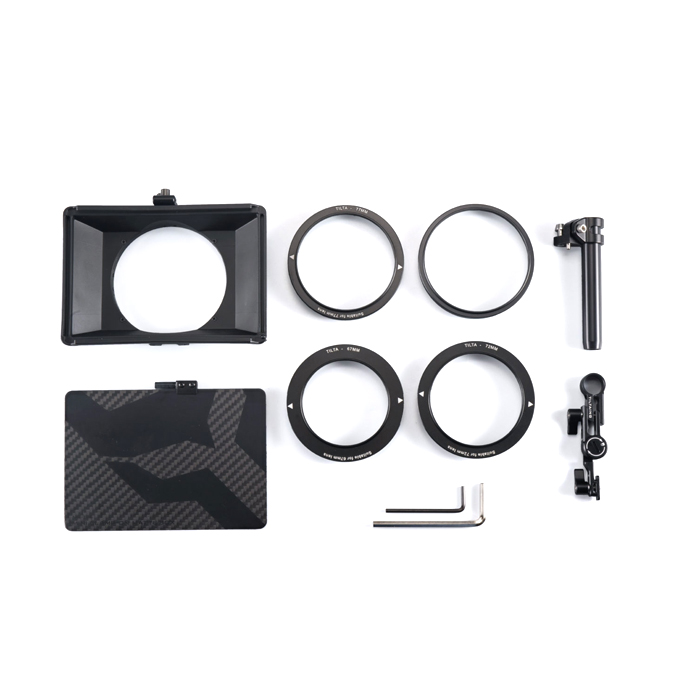 The kit includes the Mini Matte Box, top french flag, 15mm single rod support attachment, and four lens adapter rings (82mm, 77mm, 67mm, and 72mm).