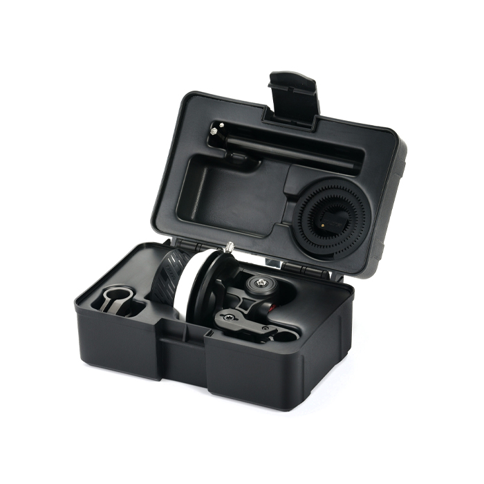 This new system improves on the design of the Mini Follow Focus and is constructed with a new composite material that greatly improves the mechanics of the system while remaining lightweight and compact.