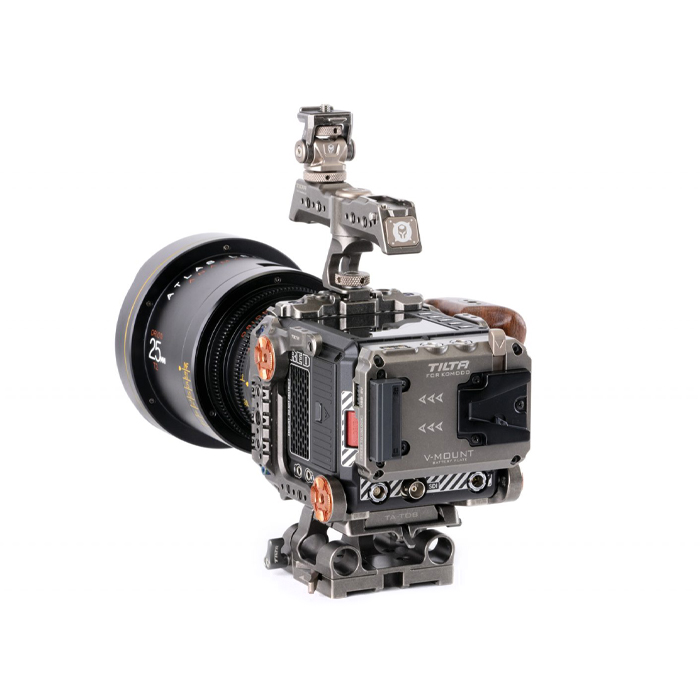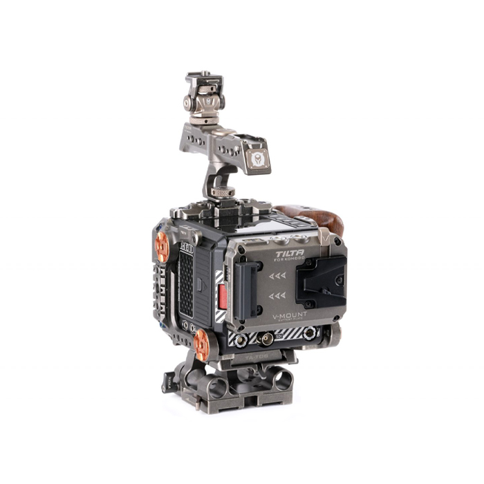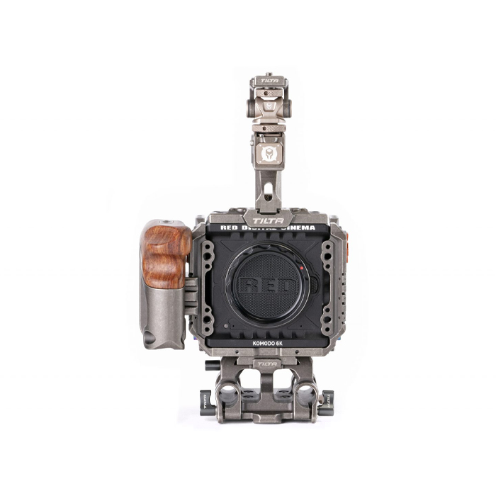 The kit includes the base RED Komodo cage, right side wooden handle, quick release top handle, Arca and Manfrotto quick release baseplates, 15mm LWS baseplate, an Adjustable Cold Shoe Accessory Mounting Bracket, and finally a Dual Canon BP to V Mount Adapter Battery Plate to allow for a longer battery life for your camera.