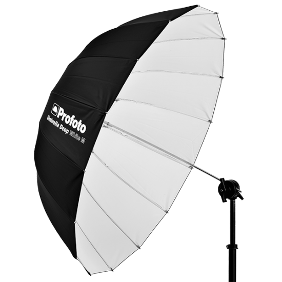 Profoto Umbrella Deep M is unique in that it is small and lightweight yet deep and parabolically shaped. The deeper shape gives the photographer better control of the light spread. It also allows the photographer to focus and shape light by simply sliding the umbrella shaft in its holder. Profoto Umbrella Deep M is available in three versions: silver, white and translucent. The white version creates a soft but still direct light, perfect for portrait and beauty shots. Attach the optional diffuser for a softer, more even light spread.