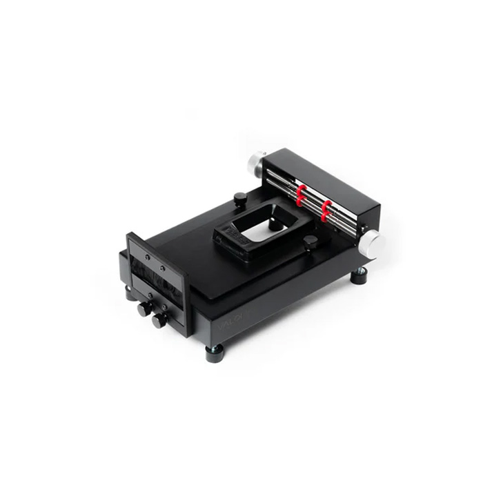 VALOI Duster er måske det mest populære tilbehør til VALOI 360-systemet. Den har en aluminiumsramme, der er anodiseret helt sort med en mat overflade for at sikre, at der ikke er nogen refleksioner. I den er der to børster af høj kvalitet med antistatiske børster, der har en ekstremt fin børste for at sikre, at den ikke ridser filmen.