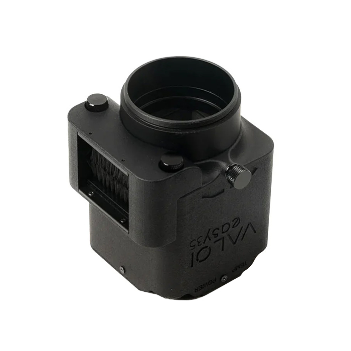 It attaches conveniently to the side of the VALOI easy35 body using two thumb screws. The two brushes are then sitting in-front of the holder opening where you push film in.