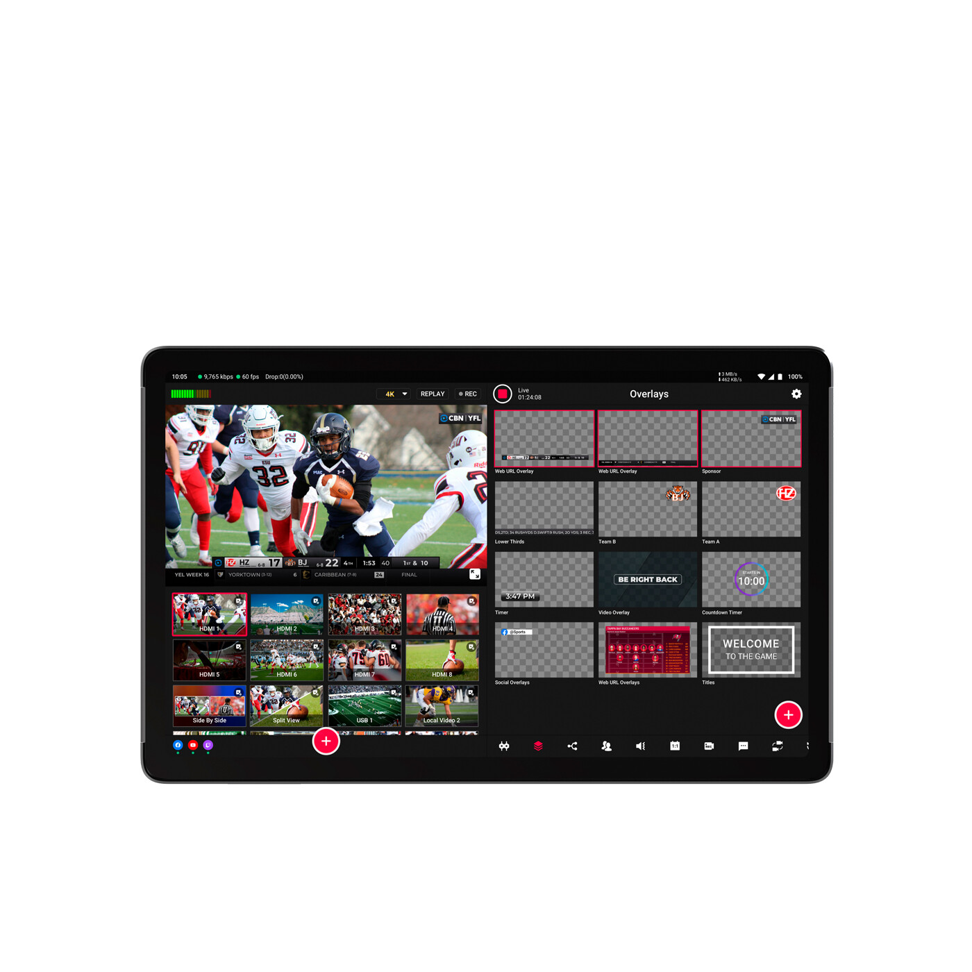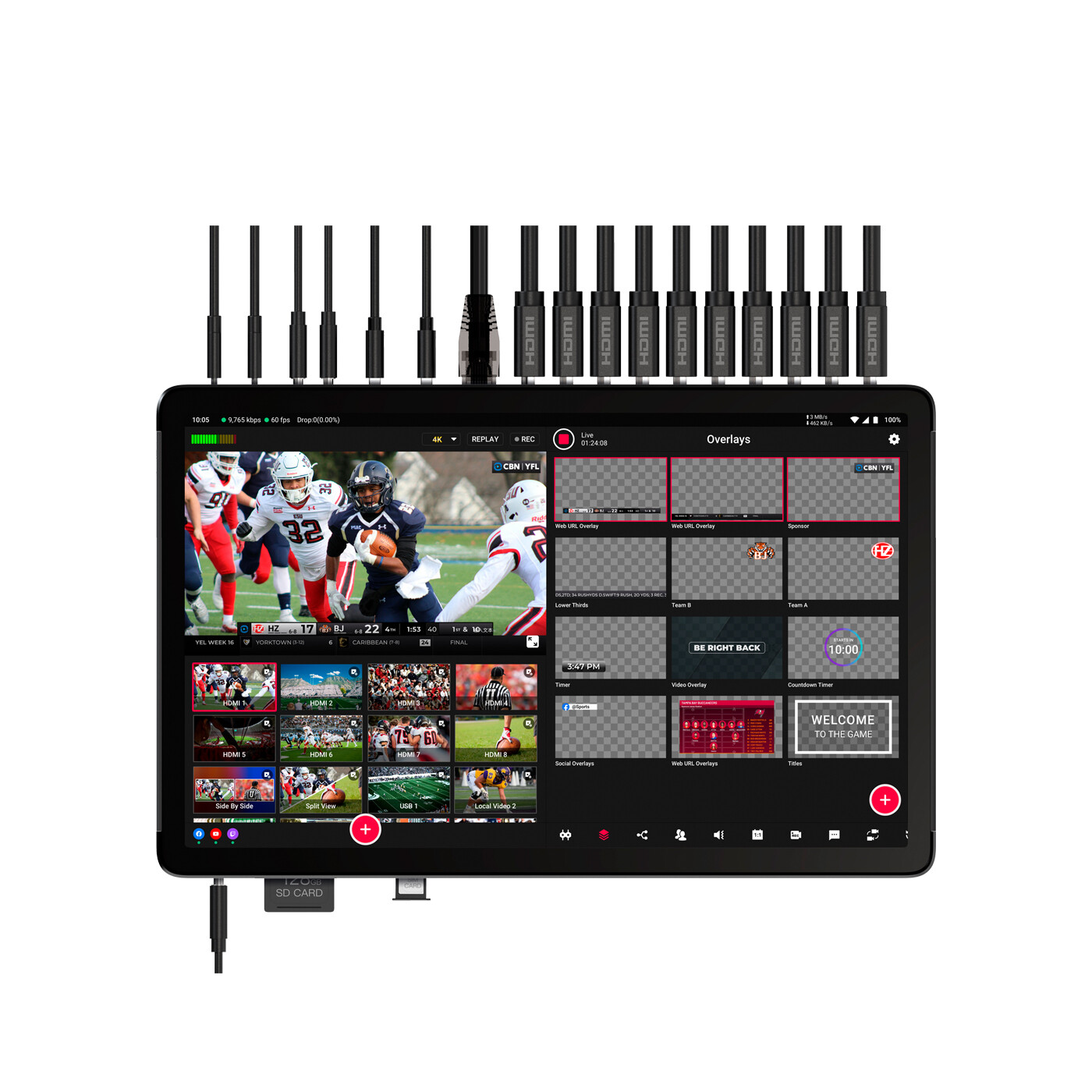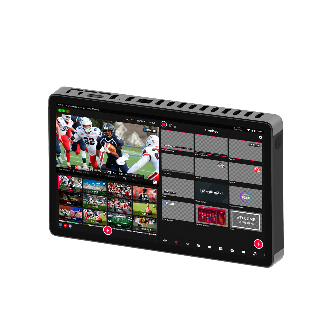 Multikameratilslutning: Yolobox Extreme kan tilsluttes flere forskellige indgange, f.eks. 8 HDMI-indgange, 2 USB-A, 1 USB-C og 8 NDI-indgange, som kan tilsluttes trådløst eller via ethernet. Skift mellem dem i realtid, og styr lydniveauerne ved hjælp af den integrerede mixer. 2 HDMI-udgange kan tildeles uafhængigt (Program, Multiview eller Preview) og udsendes i 4K.