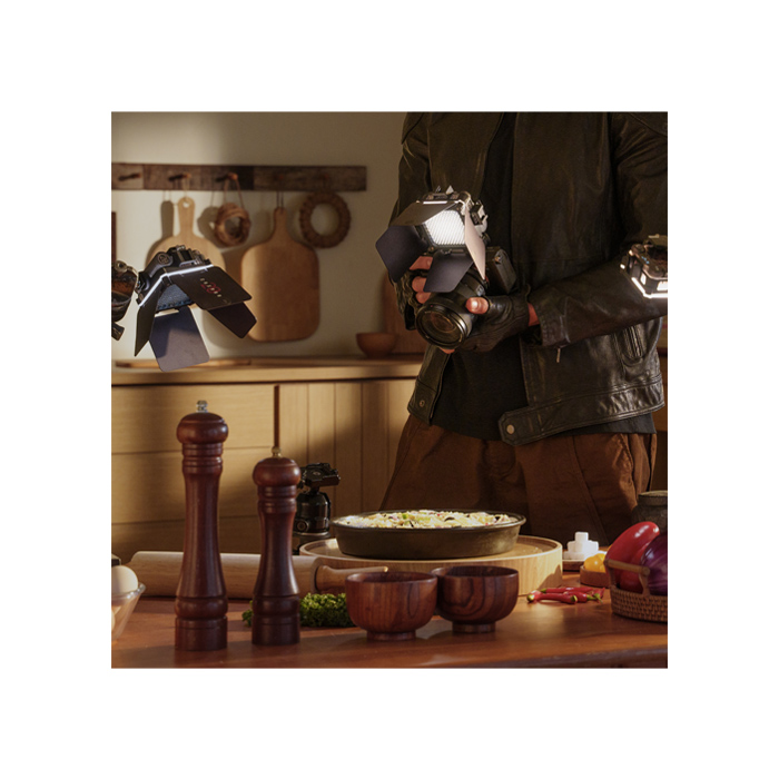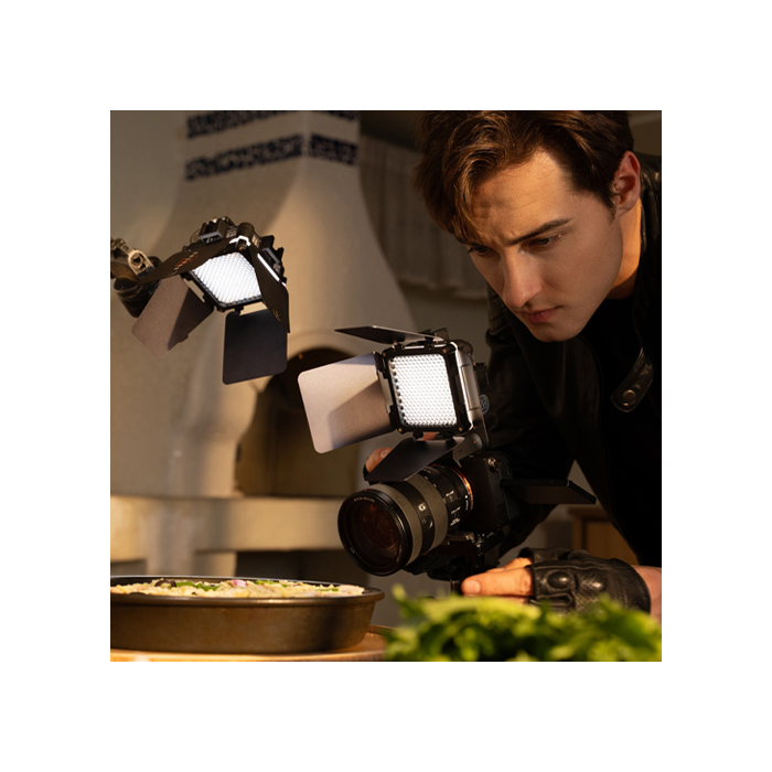 Experience cinematic excellence with premier lighting accessories. The dual-side extension bracket and cold shoe allow users to attach individual diffuser, honeycomb grids, 4-leaf barn doors or make combinations for diffused, focused, or shaped lighting.