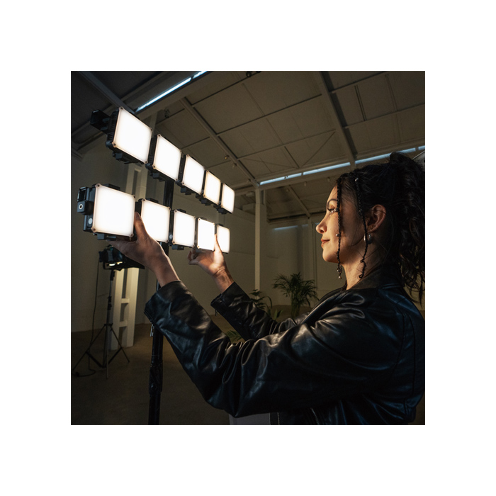 Experience cinematic excellence with premier lighting accessories. The dual-side extension bracket and cold shoe allow users to attach individual diffuser, honeycomb grids, 4-leaf barn doors or make combinations for diffused, focused, or shaped lighting.