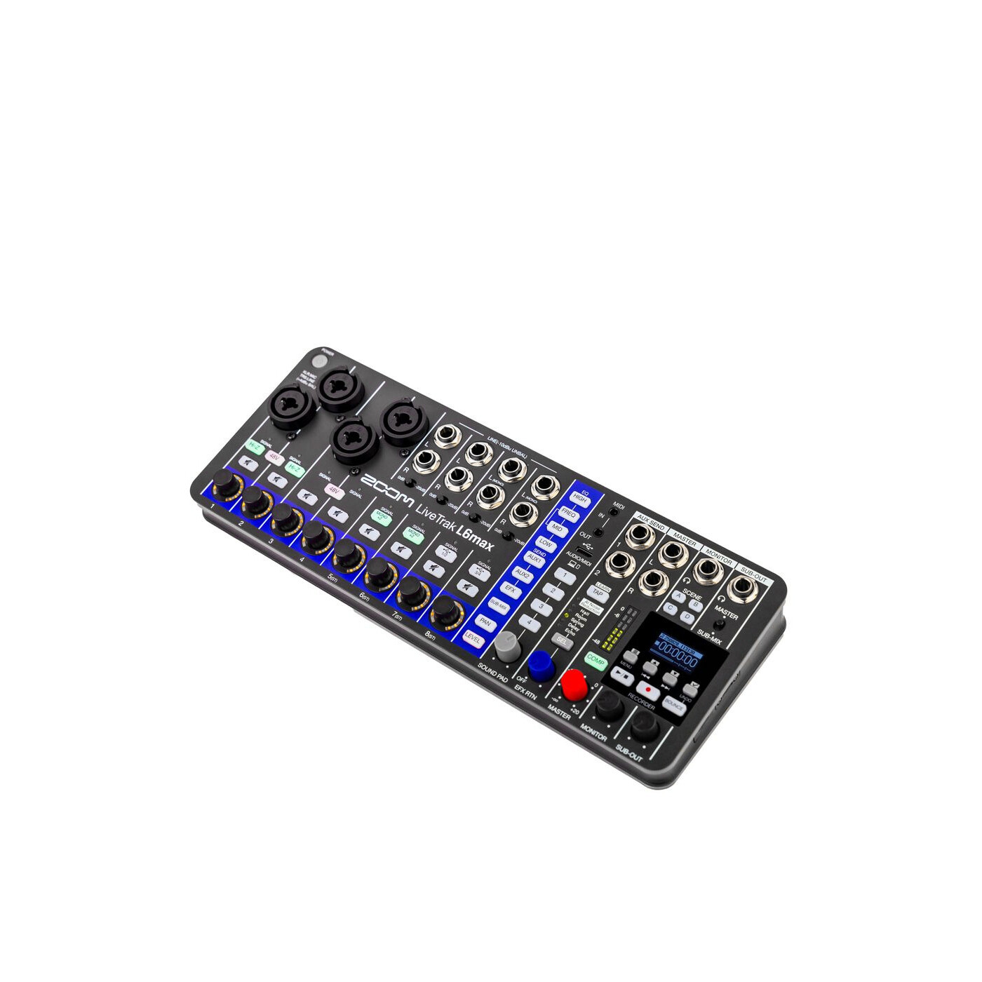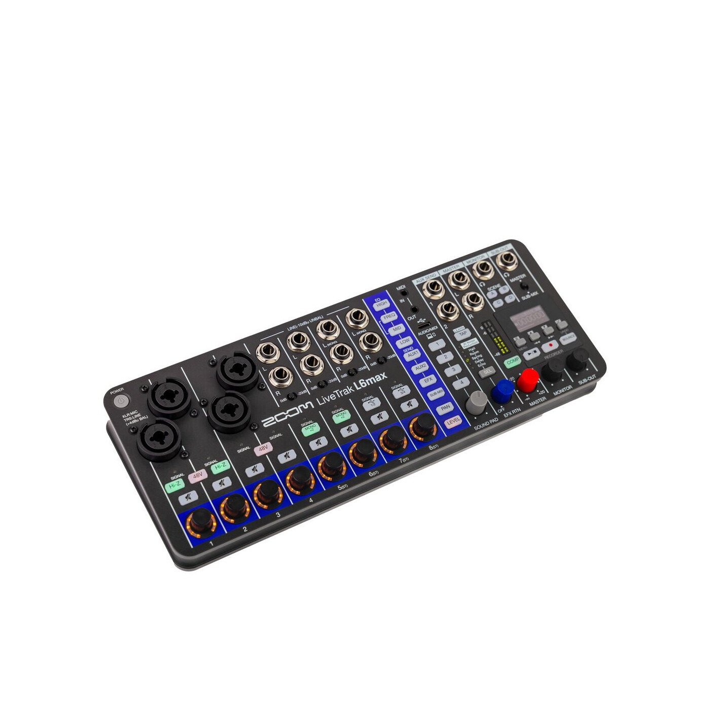 Whether you are a full-band, an acoustic duo, or a solo performer, the L6max is ready. With 4 combo inputs (including 2 with Hi-Z) and 8 line inputs, its 12 channels offer the flexibility you need for any session.